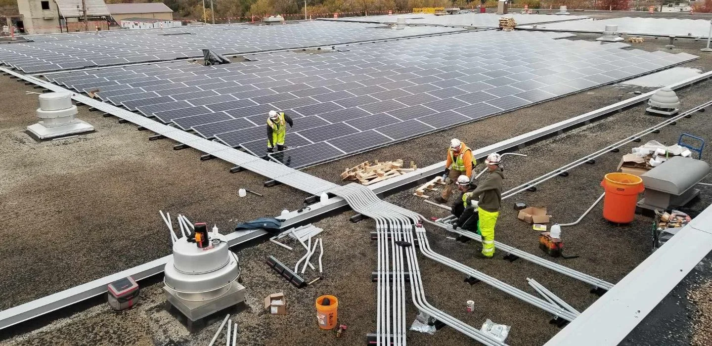Image: Installation of the City of Wauwatosa’s City Hall/Library complex solar array, which produced 55% of the complex’s total energy usage during its first year